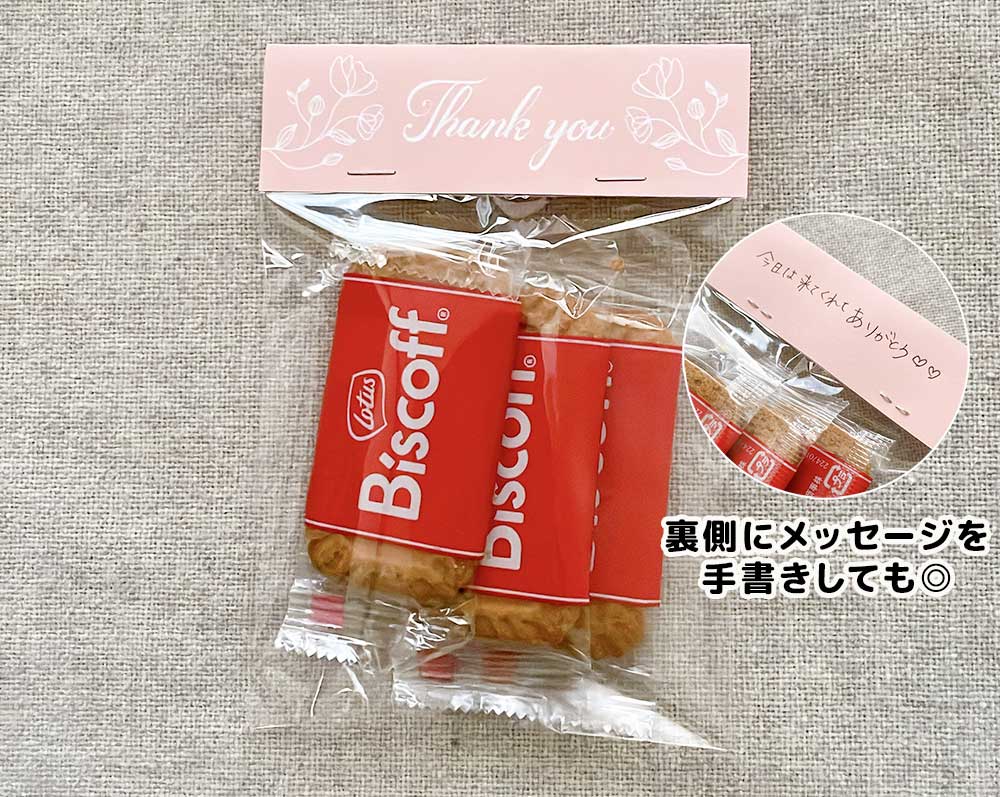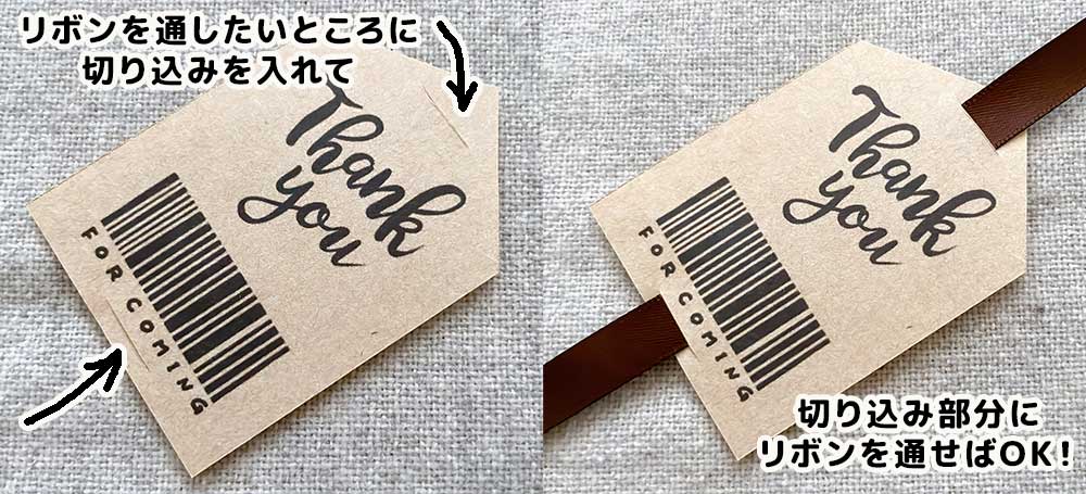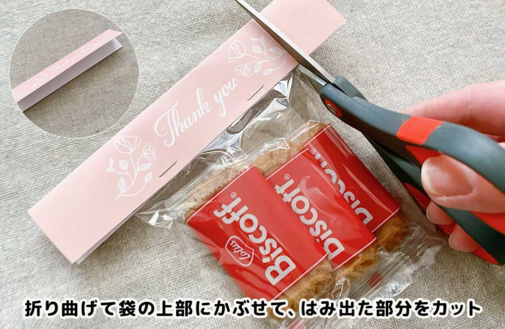 折り曲げてふたをするイメージで使うサンキュータグはこんな感じでラッピングします。不要な部分はカットしてお使いくださいね。