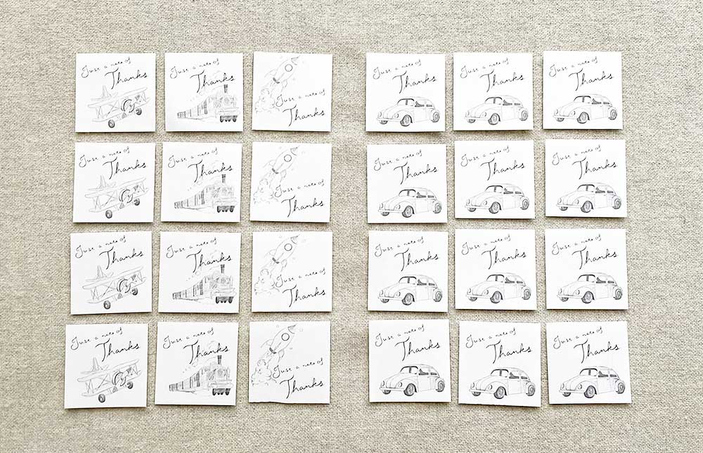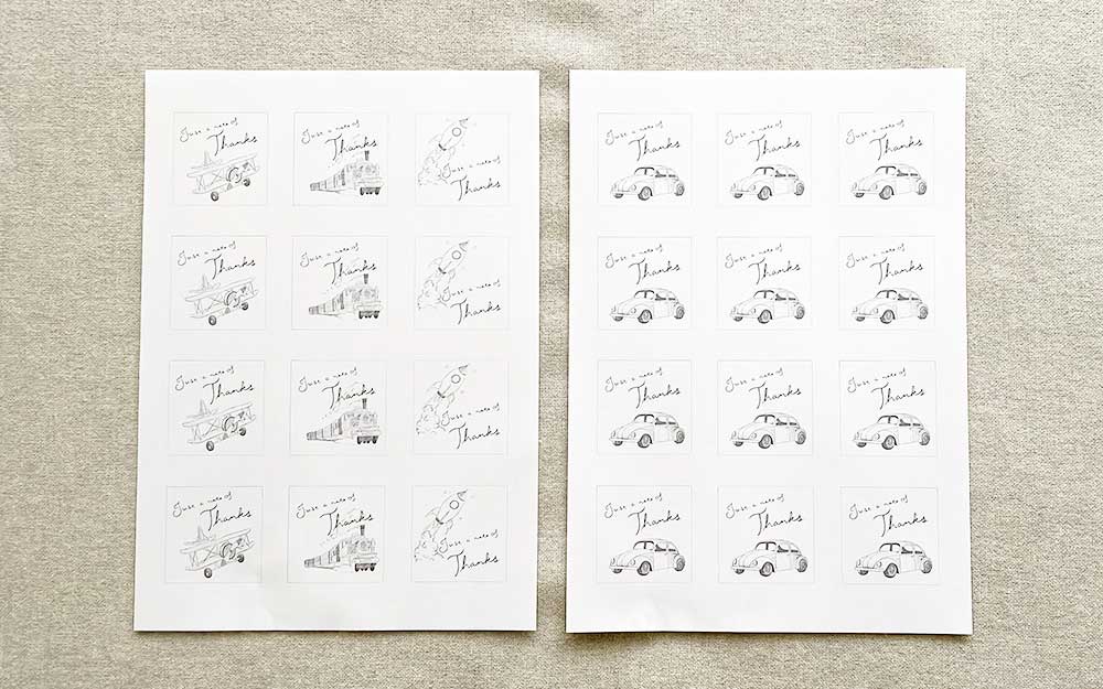 印刷できたら、枠線に沿って、ハサミやカッターを使ってカードを切り分けていきます。このテンプレートでは、一枚のシートにつき12枚分印刷できます。