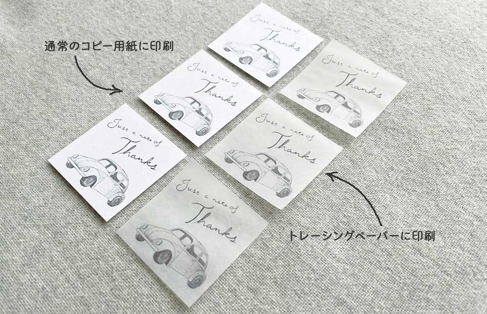 今回は通常のコピー用紙以外に、透け感のあるトレーシングペーパーにも印刷してみました。用紙が違うと質感や雰囲気が違いますね。