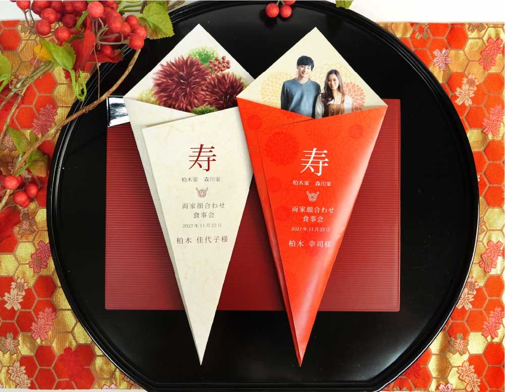 どんなシーンにもあわせやすいほのぼのとした和風デザイン。おめでたいモチーフを随所にちりばめて、慶びの日にふさわしいデザインです。