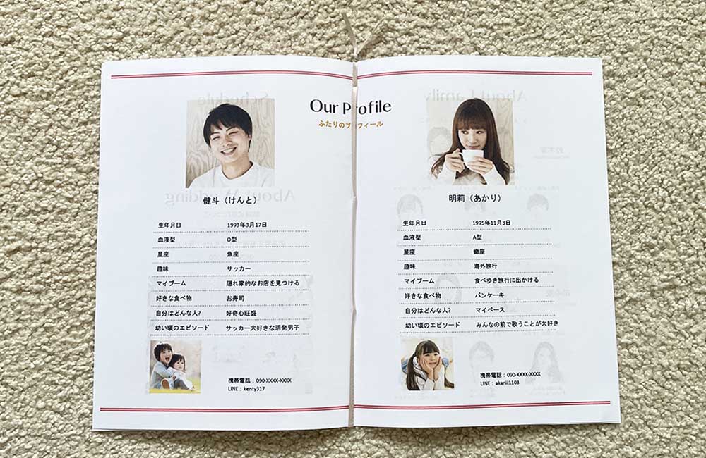 ふたりのことをお互いの家族に知ってもらうため、人となりがわかるようなプロフィールを入れましょう。いずれもひと言でまとめて、その場の会話が盛り上がるキッカケにするのがおすすめです。