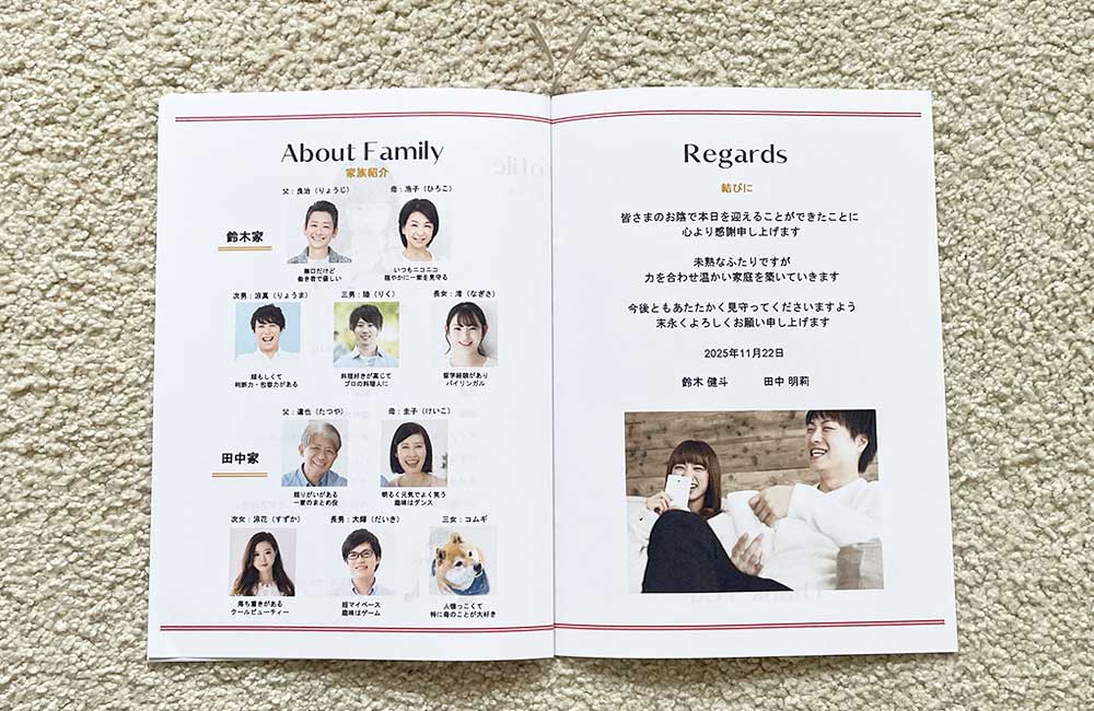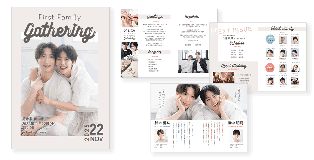 つまり、しおりは顔合わせ会を成功に導いてくれる頼れる存在。どきどき緊張の顔合わせ会も、しおりを準備しておけば安心。自信をもって当日を迎えることができますよ。また、当日の記念としてカタチに残すこともできますし、当日出席できなかった家族や祖父母に渡すこともできる点もメリットです。