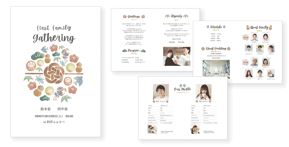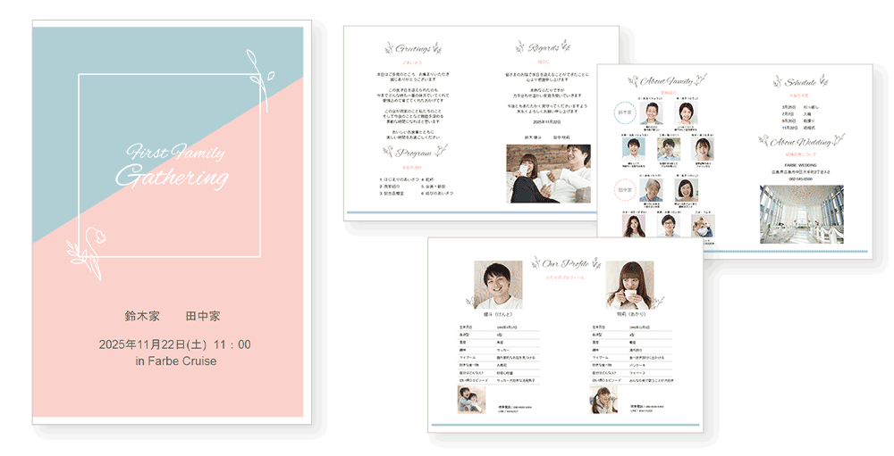 顔合わせしおりには、ふたりのプロフィールや家族紹介、当日の会の流れなどを盛り込みます。初対面でも会話の糸口をつかみやすく、コミュニケーションツールとして活躍。両家のことを深く理解しあうきっかけになります。