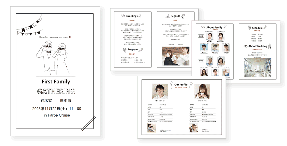 とはいえ、何を入れたらいいのか悩みますよね。顔合わせしおりのことを知り抜いているファルベがズバリ、おすすめの内容をご紹介します!