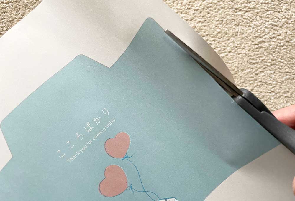 印刷できたら、ハサミを使いグレーの線に沿って封筒を切っていきます。