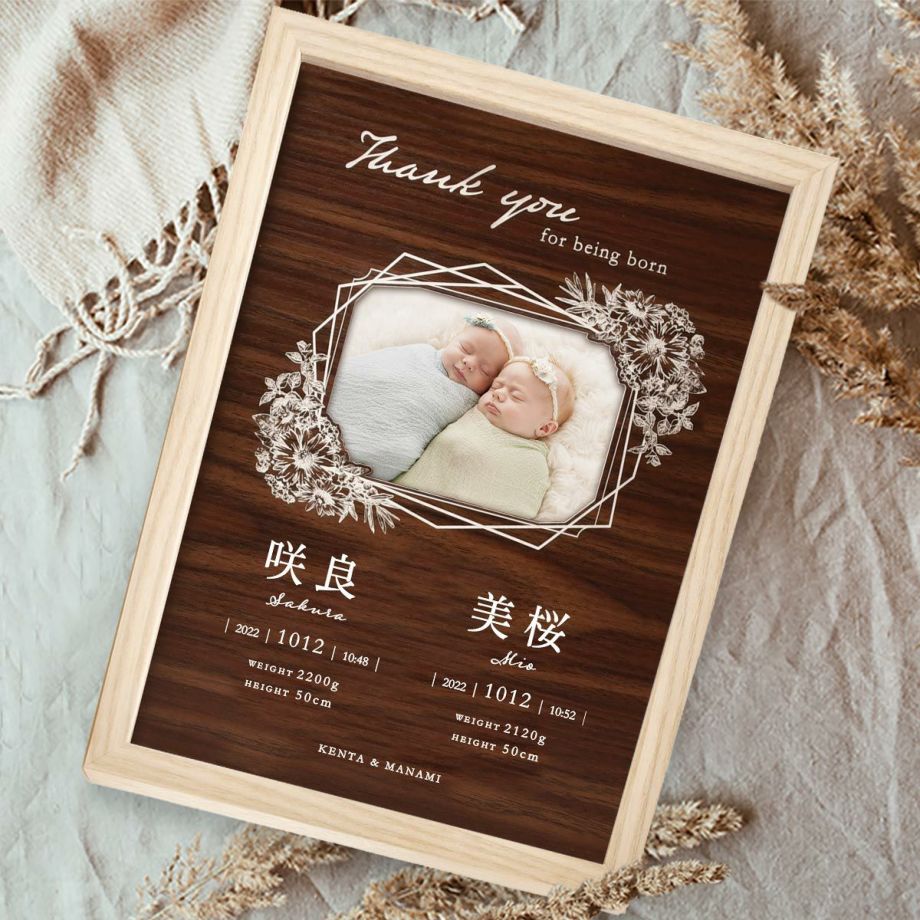 二層板アクリルにおしゃれな線画デザインとふたりのお子様の名前や誕生といった大事な記録をレーザー彫刻する命名書。写真を入れ替えながら楽しめるフォトフレーム仕様だからお子様の成長と共に写真を入れ替えながら長く飾っていただけます。