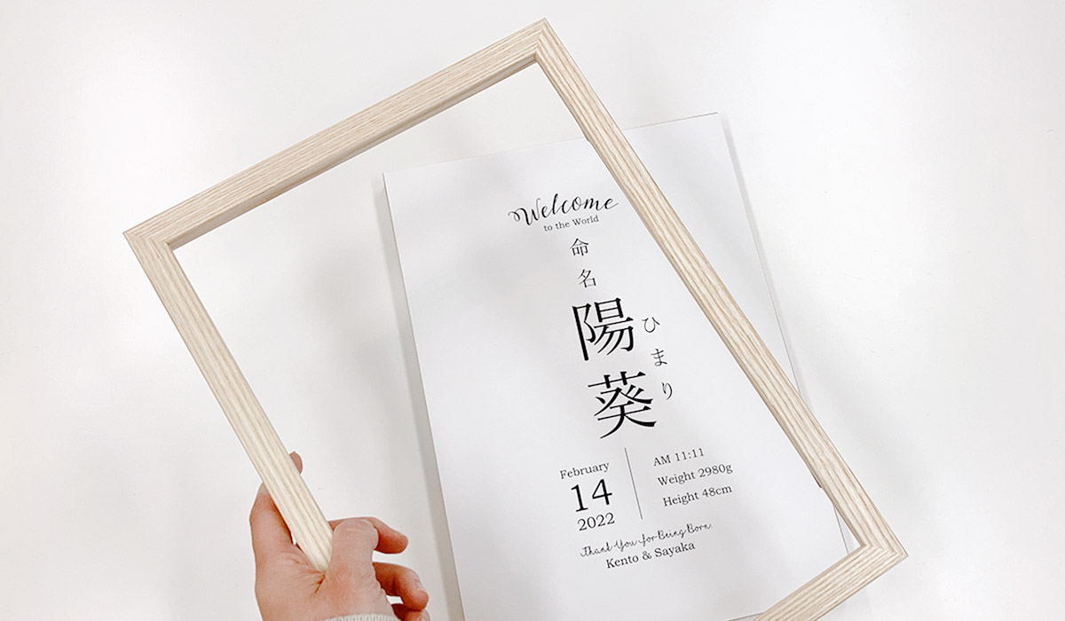 印刷した命名書をA4サイズのフレームにいれておしゃれな命名書の完成です!