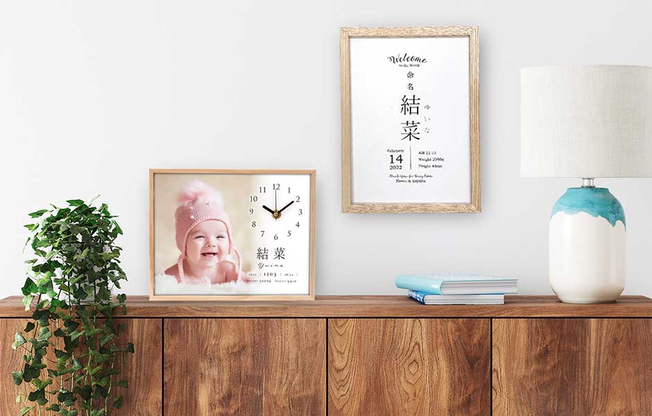 透明感が美しいアクリルの文字盤にお写真をレイアウトして赤ちゃん誕生の喜びを記した時計付き命名書です。いただいたお写真をもとにプロのデザイナーが文字盤や文字の位置まで細かくレイアウトするので、とっておきの一枚で最高の記念品を作ることができます。