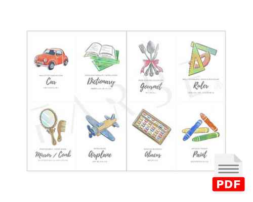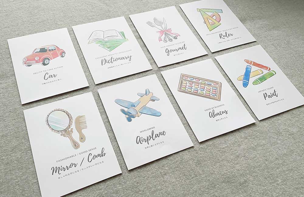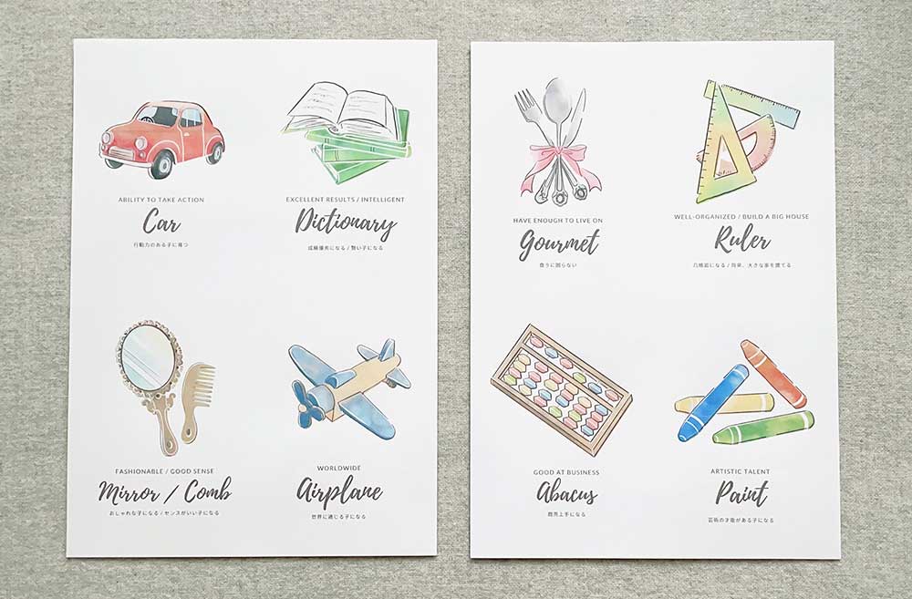 「選び取り」をする際は、家に実際にある品物を並べて選ばせるのですが、最近ではその品物のイラストを描いたカード等で代用するやり方もあり、品物を準備する手間も省けるため、気軽にできる「選び取りカード」を利用されるケースも増えています。