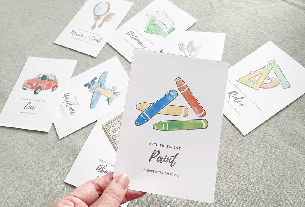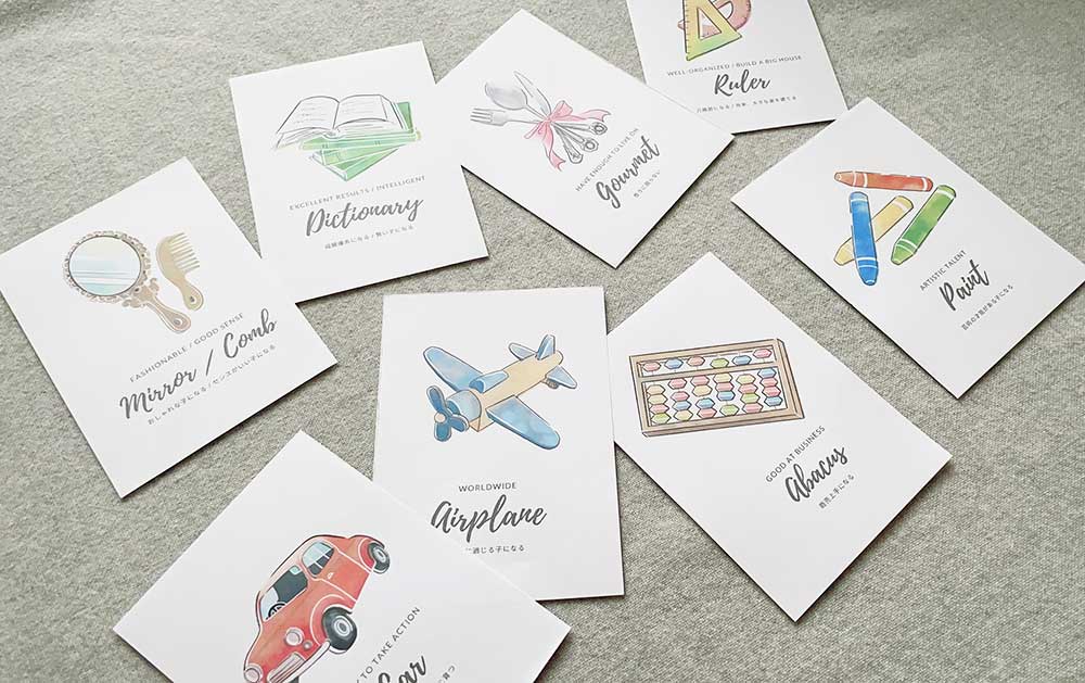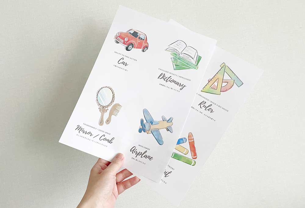 1歳のお誕生日に、子供の目の前にそれぞれ意味を持たせたアイテムを並べ、子供が何を選ぶかで子供の将来の職業や才能を占うという、「選び取り」と呼ばれる記念行事があります。そこで使われるのが「選び取りカード」です。