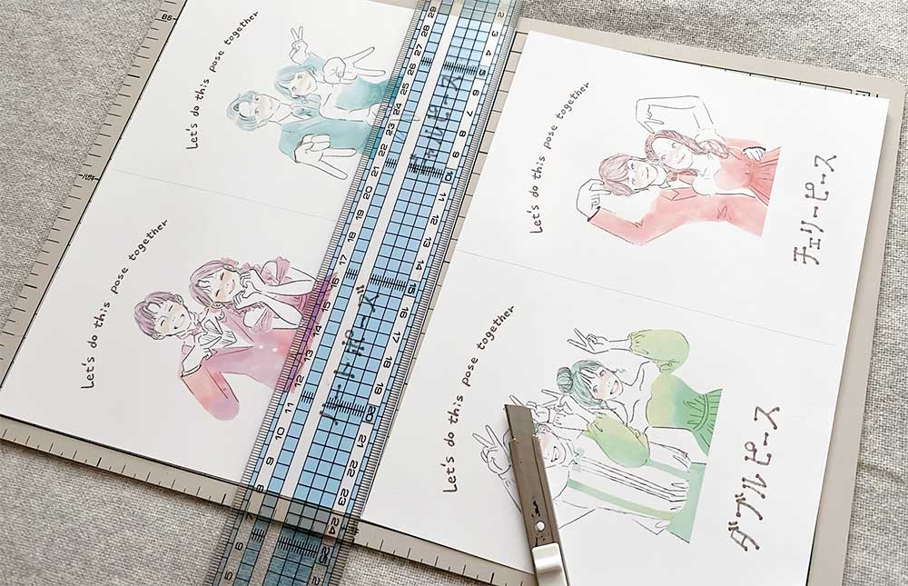 印刷できたら、切り取り線に沿って、ハサミやカッターを使ってカードを切り分けていきます。今回、8枚のポーズカード(A4サイズ2ページ分・1ページに4枚ずつのカード)が制作できます。