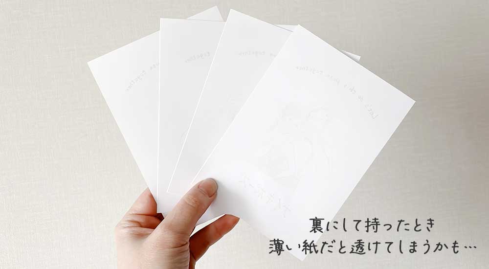 - ハガキくらいの厚みのある厚口のペーパーがおすすめです。薄手の紙に印刷すると透けてしまいますが、印刷した用紙の裏に別の厚紙を貼り付けてアレンジするアイデアもおすすめです。