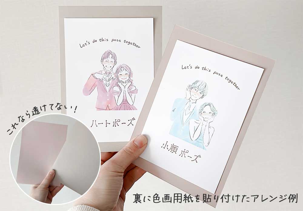 最初からハガキくらい厚みのある透けそうにない用紙に印刷するか、印刷した用紙の裏に別の用紙を貼り付けてアレンジするとうまくいきそう。今回はくすみカラーの色画用紙(百円ショップで購入)を貼り付けてみましたが、良い感じです!
