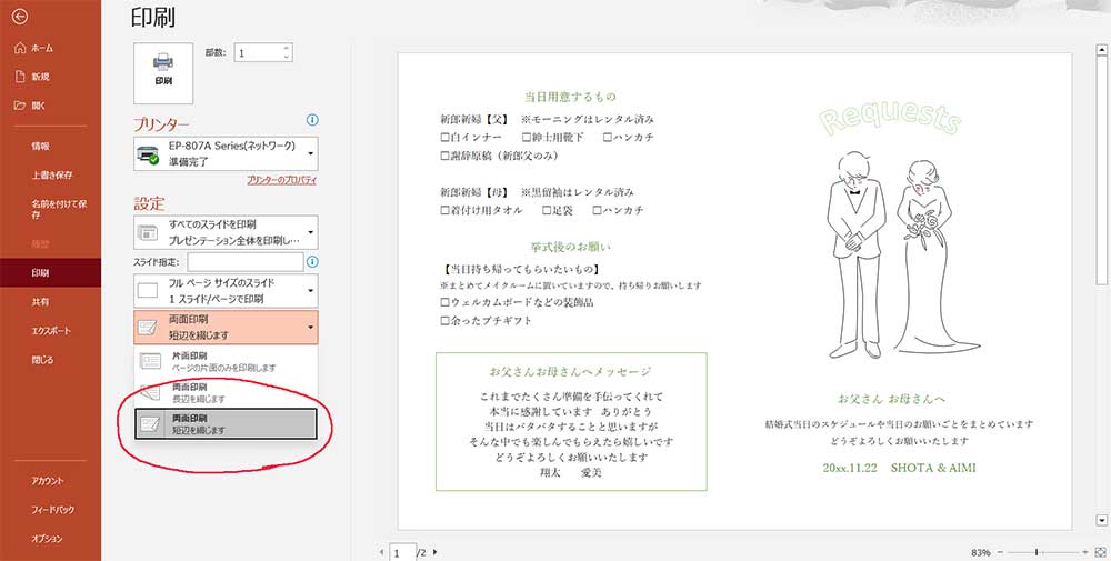 データが完成したら、お好みの用紙を準備して、プリンタで印刷します。お使いのプリンタにより設定方法は異なるかと思いますが、今回使用したプリンタでは、両面印刷の短辺とじという設定で印刷するとうまく両面印刷できました。