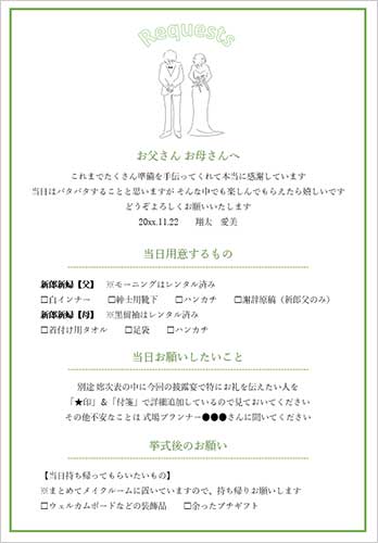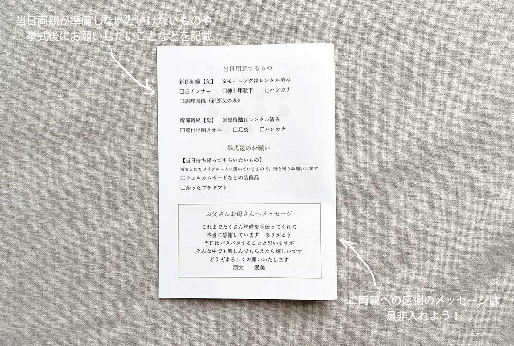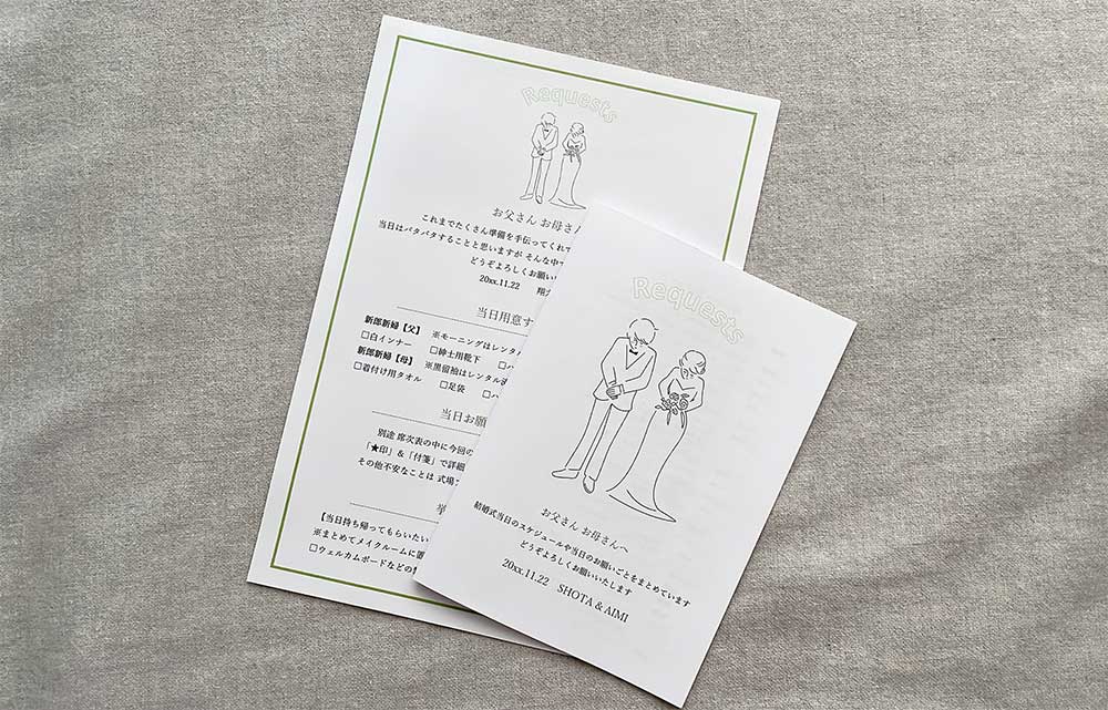フォーマットや内容などに決まりはなく、必ず準備しなくてはいけないものではありません。ただ、両親へ事前に伝えておきたいことやお願い事がある場合、それを口頭で伝えるのはさすがに忘れる可能性もあるし、言った言わないでもめる原因にもなりかねません。メールで伝えるのも整理しにくいし、読み返しづらい…。そんな時のためにご活用いただきたいアイテムです。依頼事をわかりやすくまとめて渡しておけば、お互い安心ですもんね♪