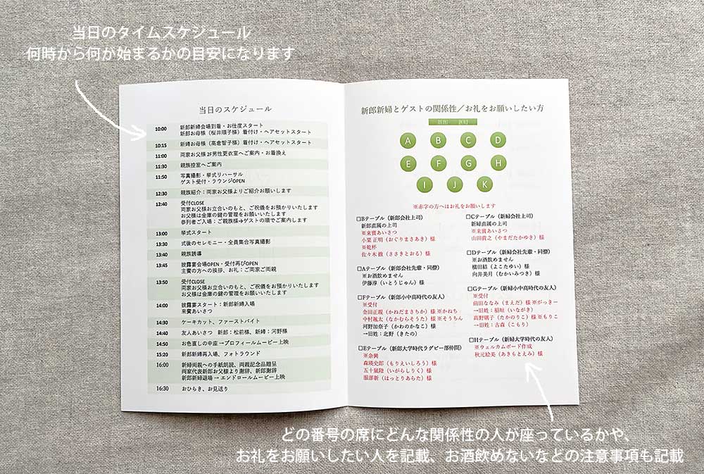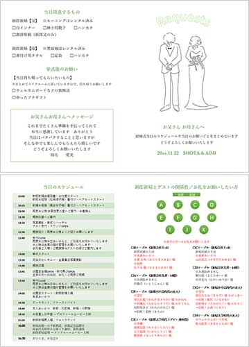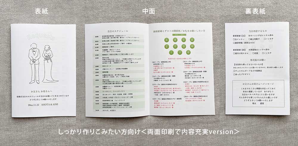 両面印刷タイプ(両親へのお願い書①/A4両面印刷)は、中面に当日のスケジュールやゲストに対する注意事項やお願いごとを詳細に記載できるので、しっかり作りこみたい方向け。