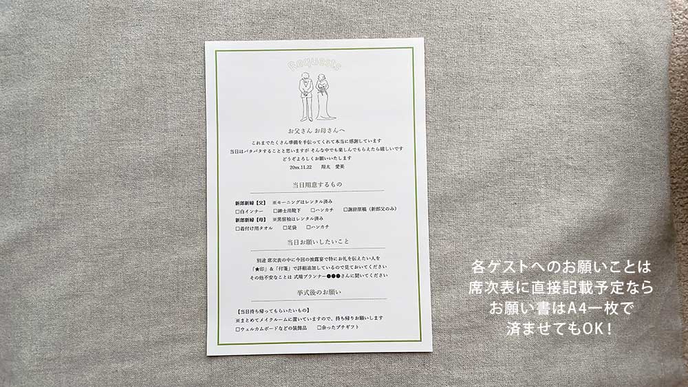 ご両親も結婚式当日はいろいろ分からないことだらけで不安ですし、新郎新婦に確認する時間なんてありません。両親へお願いごとをするなら、相手が安心して引き受けられるような工夫をしておきたいですね。