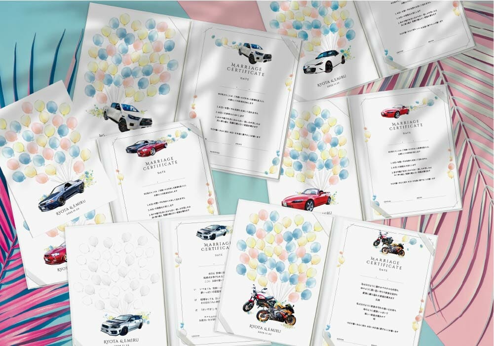 また、愛車をデザインに取り入れた結婚証明書など、自分たちならではの個性を持たせる方も多く、結婚式をより個性的で華やかに演出する重要な要素となっているようです。