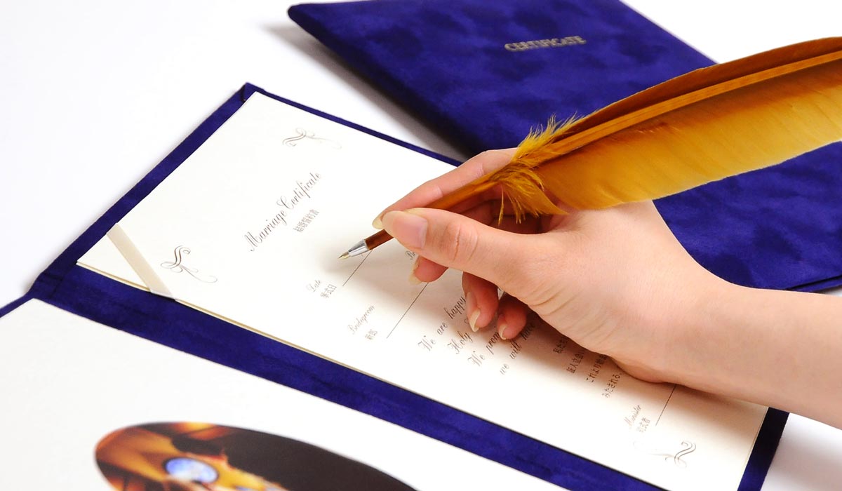 結婚証明書とは、教会式や人前式で用いられる二人の結婚を証明する誓約書のこと。新郎新婦の名前や挙式日、挙式場名、司式者などが記載されており、新郎新婦が挙式時に署名します。あくまで二人の結婚を祝う儀式の一環であり、法的効力はありませんが、結婚の誓いを形に残す大切なアイテムとなります。