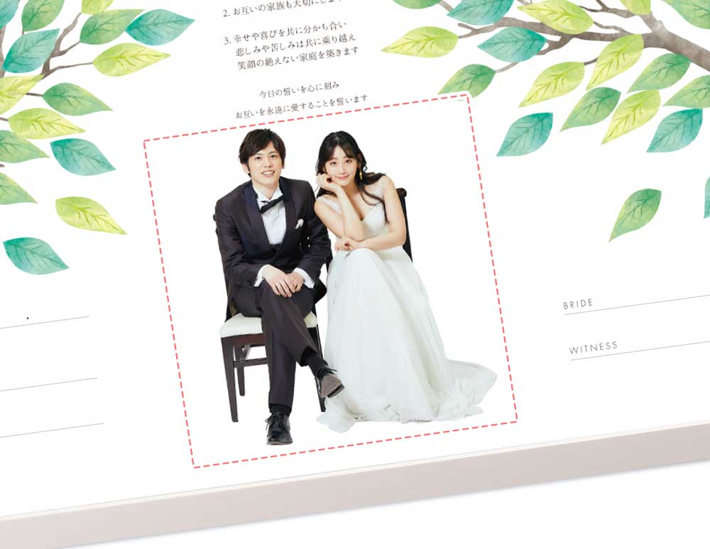 そこに、こんな風にお二人のお写真をプラスするだけで、もっと特別な結婚証明書に早変わり!一生大切にしたくなる、見返すたびに当時のことを思い出せる、素敵な記念品になること間違いなしです!!