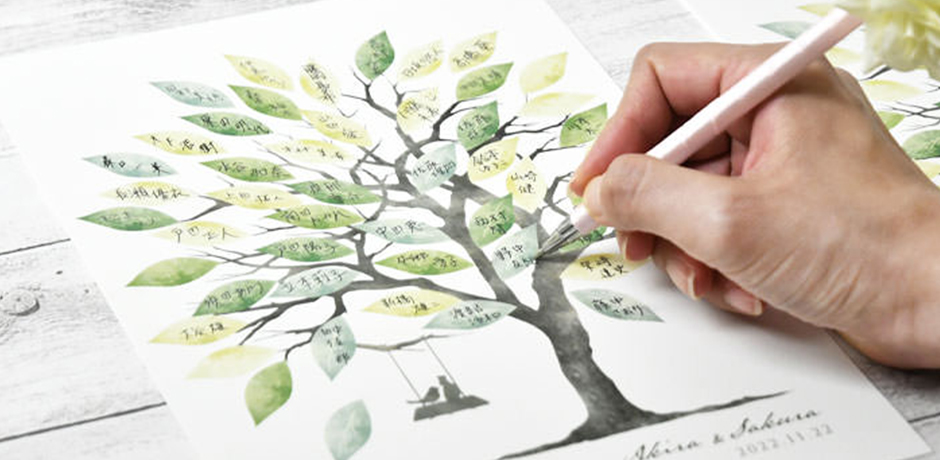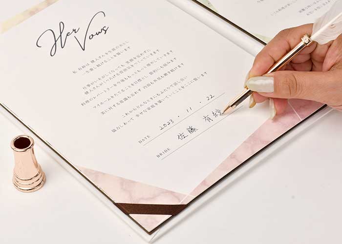 人前式では、ゲストの中から代表で1~2名に署名してもらう「立会人代表署名」や、ゲストの前で宣誓文を読み上げられるタイプのアイテムを選ぶと良いでしょう。
