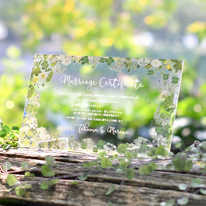 ガーデンウェディングやナチュラルウェディングにぴったりなオリジナルグラフィックデザインを施したクリアガラスの結婚証明書。