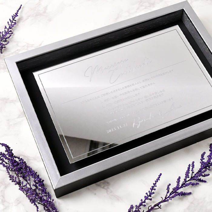 上品で美しいシルバーの輝きがスタイリッシュな結婚証明書。二人が誓約する特別なシーンに相応しいアイテムです。