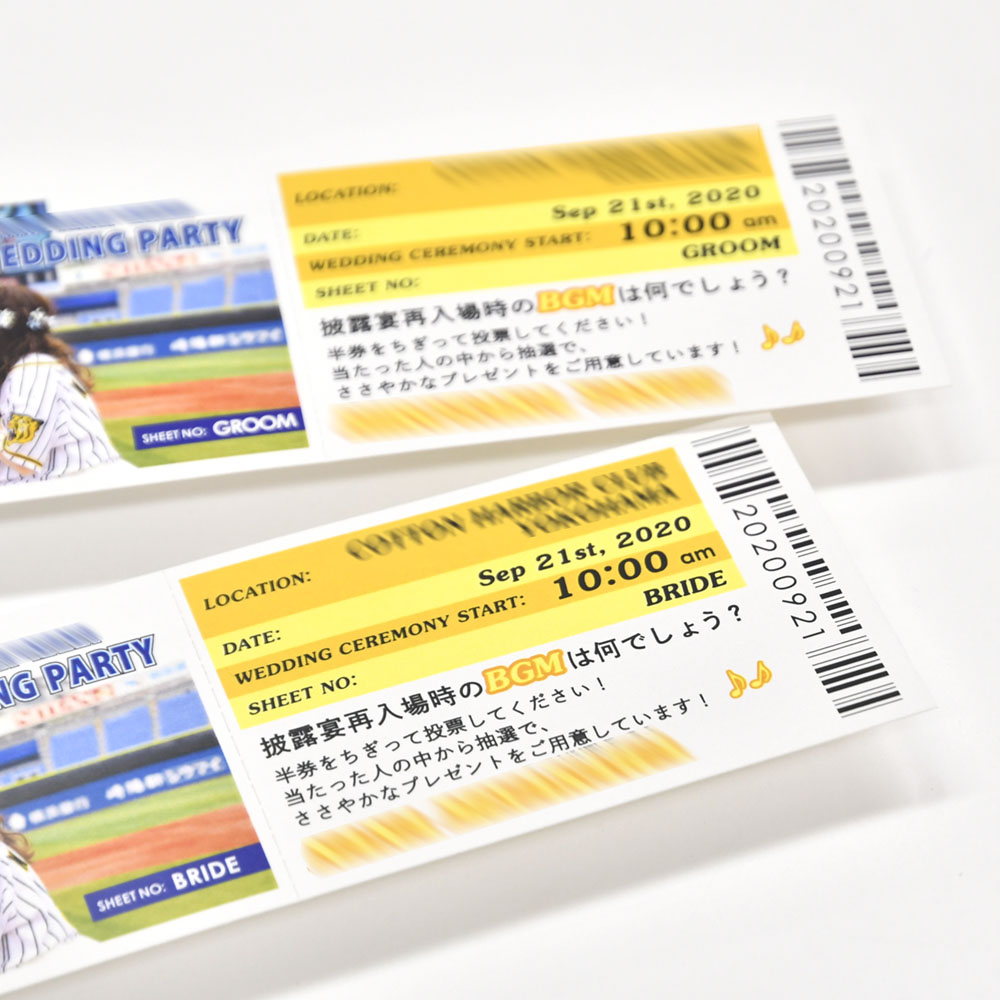 受け取った側も記念に残るデザインであることに加え、なによりチケット風なので実際にチケットを持って会場へ行くまでのワクワク感も感じられる幸せな招待状だと思います!