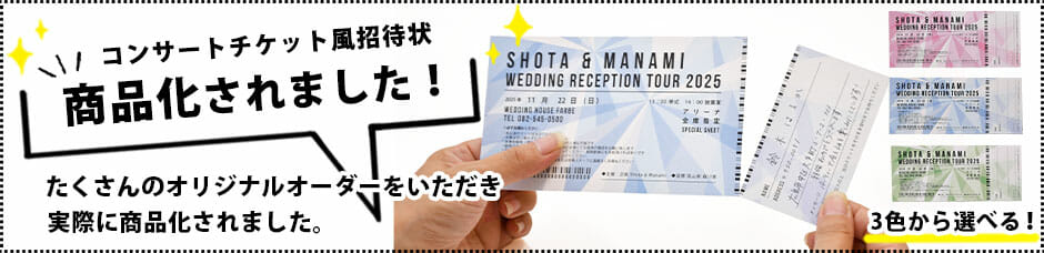 このオーダーメイドの実例が大反響。たくさんの新郎新婦さんから思い思いのデザインのコンサートチケット風招待状のオーダーメイドが続々と!多くのご要望を反映し、商品化されたのがこのコンサートチケット風招待状です。