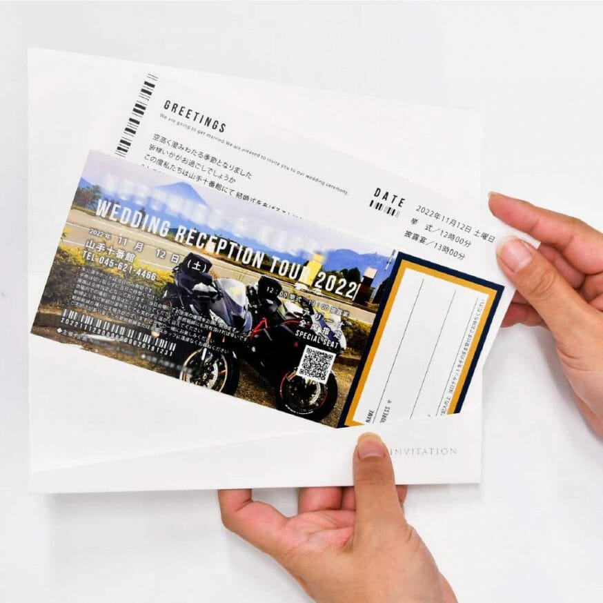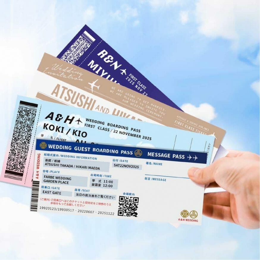 そこで人気を集めているのがチケット風の招待状。航空チケットやライブチケットなど一般的なチケットのデザインをイメージして長方形サイズにアレンジしたものが定番です。