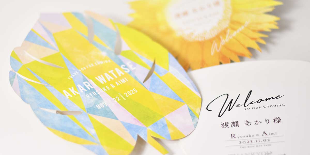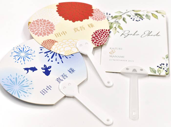 柄のタイプやサイズ、デザインも思いのまま。招待状とお揃いのデザインのうちわにしたい!というオーダーも可能です。デザインの持ち込みもお気軽にご相談ください。
