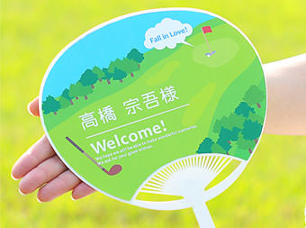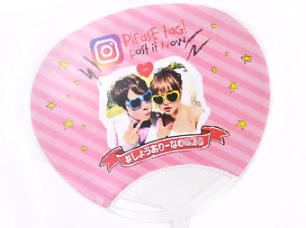 スタンダードなプラスチック持ち手がついたタイプや、丸型うちわなども人気!既存アイテムを元にアレンジも可能なので、まずは販売中のラインナップをチェックしてみよう!
