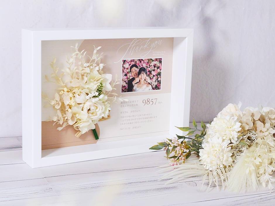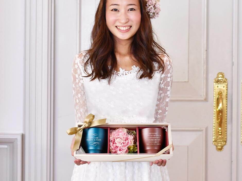 手ごろな大きさで、手にしっくりとなじみ、ご両親の毎日に寄り添ってくれます。さらにアーティフィシャルフラワーの組み合わせで華やかさも添えて。いつまでも飾っておけるアーティフィシャルフラワーは木箱から取り出して飾れるように美しくパッケージングされています。