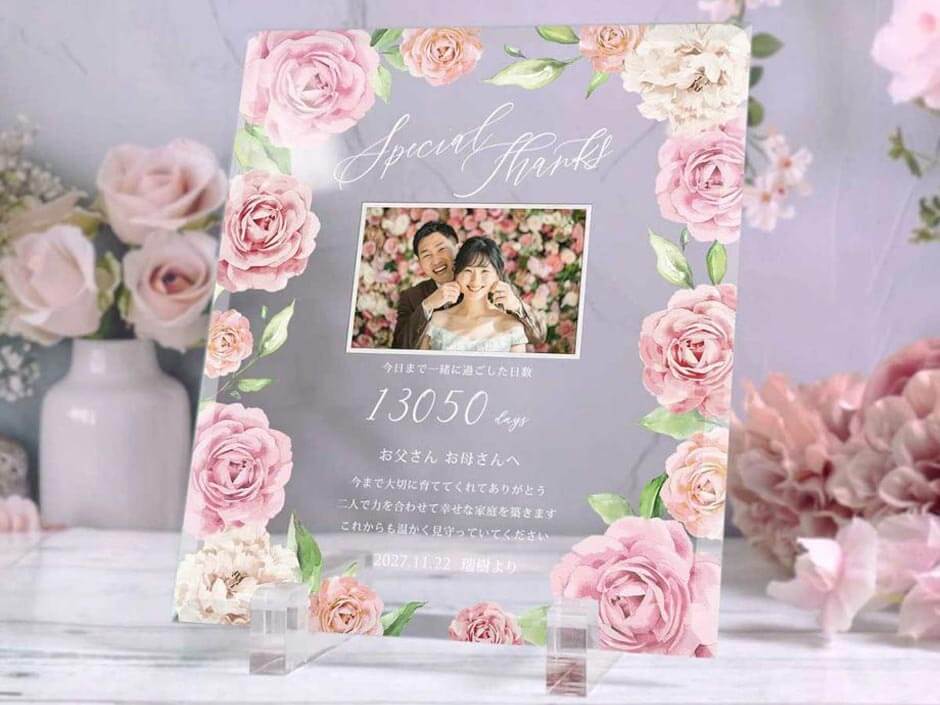 美しいクリアガラスに清楚&可憐なかすみ草のデザインをちりばめて、いつまでもインテリアとして飾っていただけるよう作られたフォトフレーム。感謝のメッセージはあとでお写真に入れ替えて2枚のお写真を飾れます。