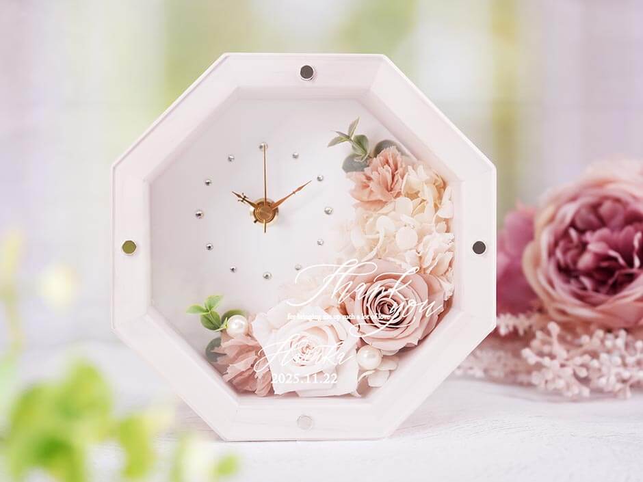 毎日の生活で実用的に使ってもらえる時計の贈り物。幸せを招く形と言われる八角形の時計にプリザーブドフラワーのアレンジが華やかでインテリアとしても最高におしゃれ。時間を確認するたび幸せな気持ちになってもらえそう♡