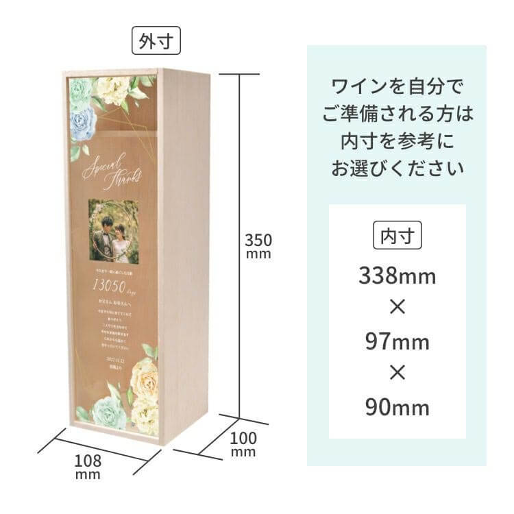 ワイン木箱のアクリル蓋に生まれてから結婚する日までのカウント日数、とっておきのお写真1枚、自分の言葉でありがとうを伝えられるメッセージをUV印刷。なんとこの木箱自体も宝物入れとしていつまでもお使いいただけるのもポイント!