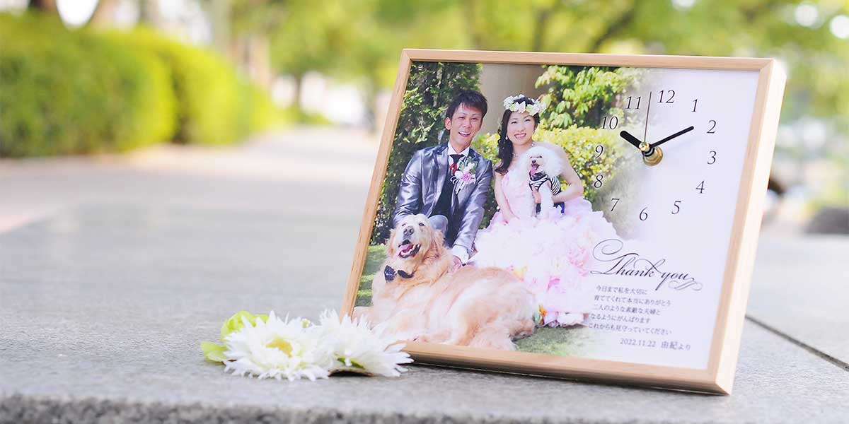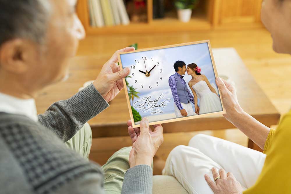 結婚式で撮影してもらった家族との写真で作成して、後日プレゼントとして渡すアイデアもオススメ!当日、プロのカメラマンさんに家族ショットを撮影してもらうといいかもしれませんね。お好みで、「Thank you」や「ありがとう」などの文字や、メッセージ、お名前なども入れることができますし、逆にシンプルに写真と時計だけという選択も可能です。