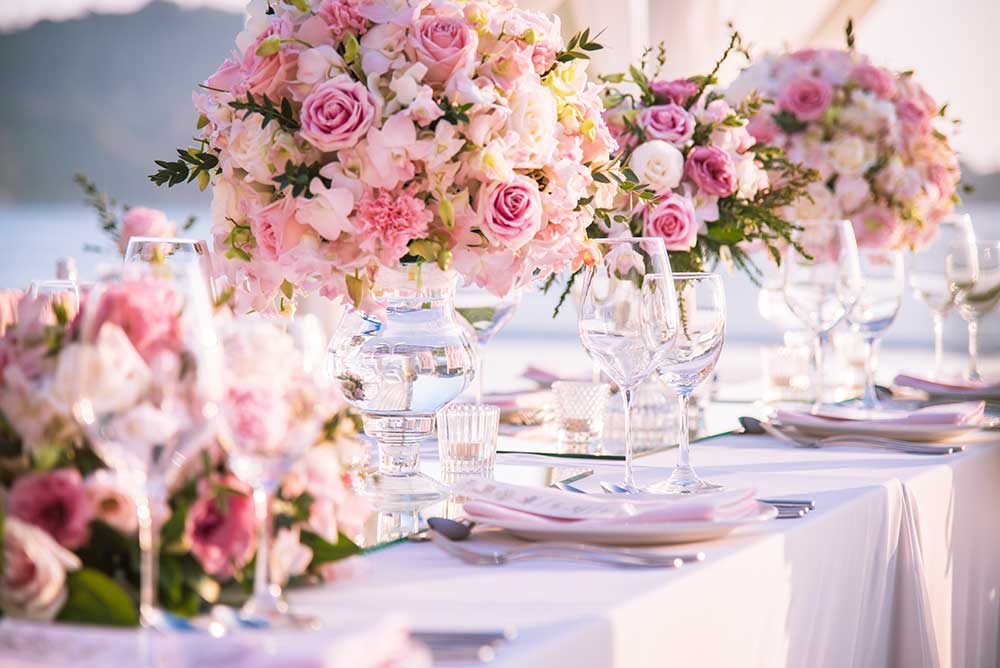 会場装飾で用いるテーブルクロスや装花、新郎新婦の衣装やブーケなど、メインとなる部分で使うのはもちろん、当日準備するペーパーアイテムや受付アイテムなどにもピンクを取り入れれば、目にも華やかなで愛らしい雰囲気が増しますよ。