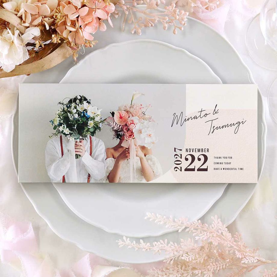 席札とプロフィールを兼用するタイプもあります。中を開くとプロフィールやメニューなど必要な項目が記載されているので、準備はしたいけど大げさにしたくない場合におすすめ。