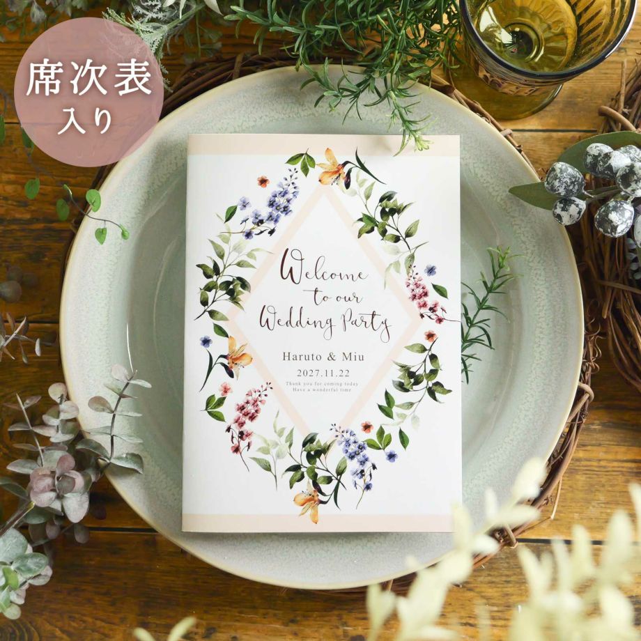 家族紹介、新郎新婦プロフィール、挨拶文、席次表、メニューなど必要な内容をこの1冊に凝縮。少人数でも席次表を用意したい、というお悩みも解決できます。