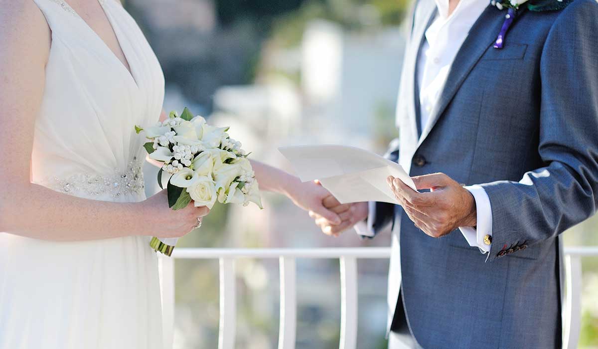 人前式では、誓いの言葉も新郎新婦で自由にカスタマイズできます。誓いの言葉を交互に読み合ったり、同じ文章を一緒に読み上げたりなど、方法はさまざまです。結婚生活への抱負を宣言し合うのもおすすめですよ。