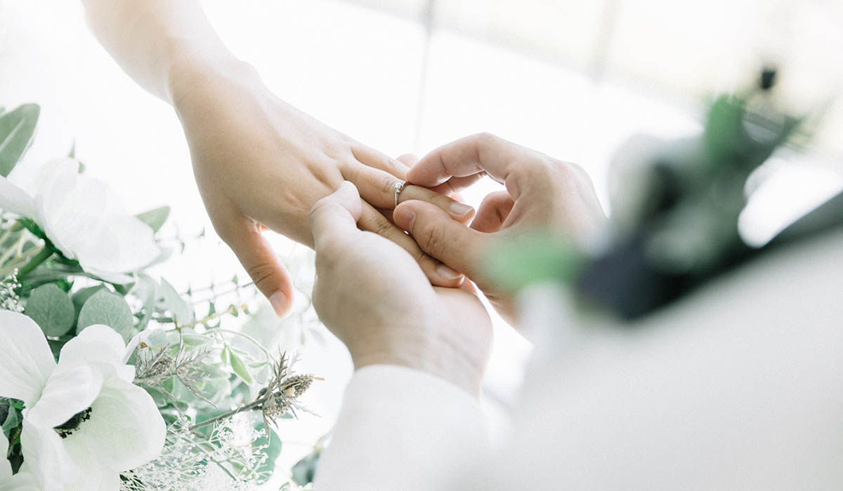 指輪の交換にも工夫ができます。例えば、ゲストに新郎側と新婦側に分かれてもらってそれぞれ一本のリボンを持ってもらい、そのリボンに指輪を通して祭壇の新郎・新婦のもとへ届けるというリングリレーは、ゲストに結婚を承認してもらう人前式ならではの演出です。