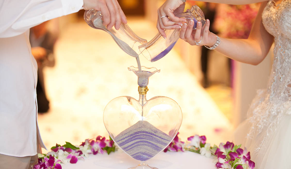 通常はふたりで別々の色の砂を同時に入れていくものですが、最近ではゲストに受付で入れてもらい、最後に新郎新婦が砂を注ぐという形式も人気です。また、水合わせの儀は記念として残りませんが、サンドセレモニーで出来上がったサンドアートは記念品として残せるメリットもあります。