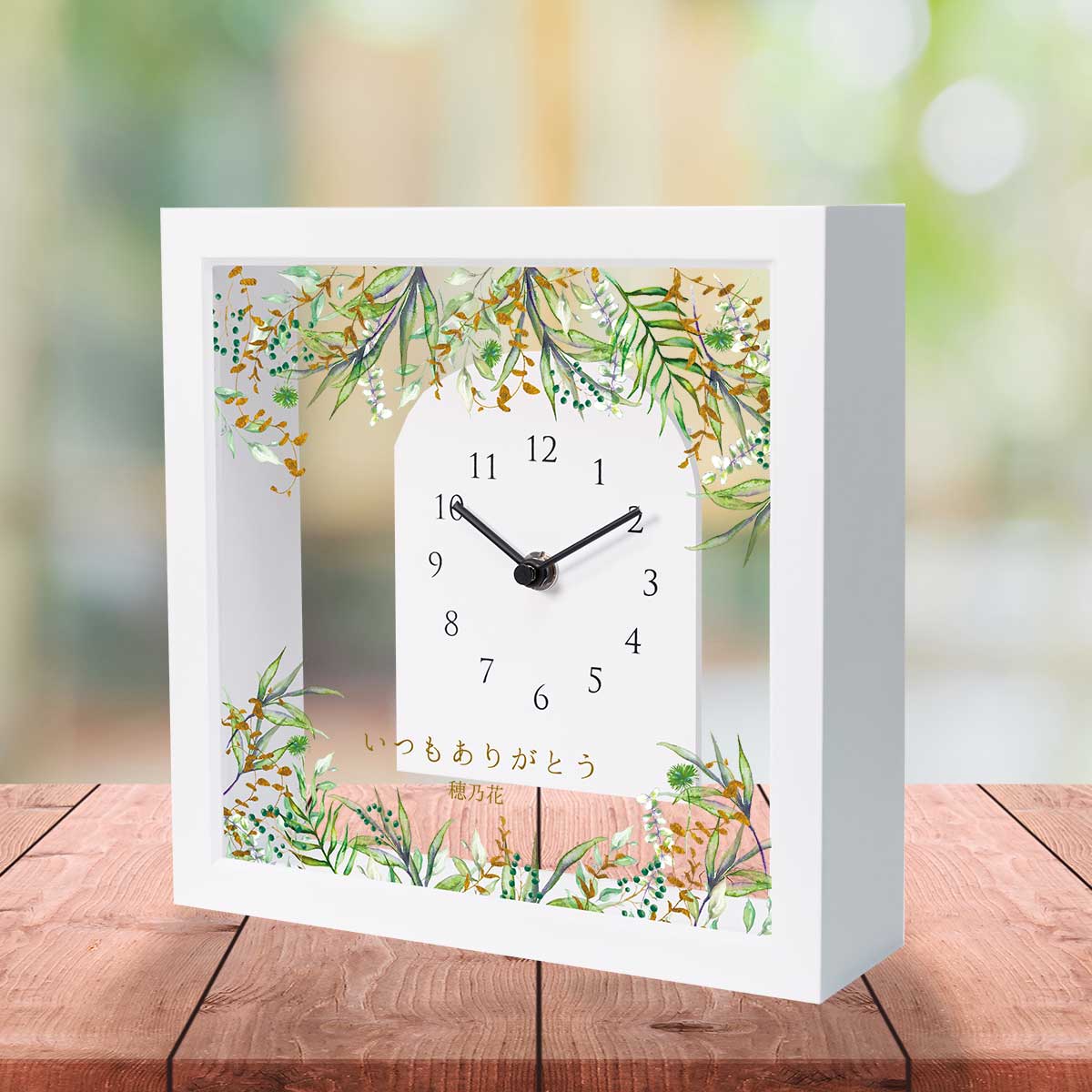 名前を入れて作る《名入れ時計》は印字する内容によってさまざまな贈り物としてご利用いただけるのが特徴。