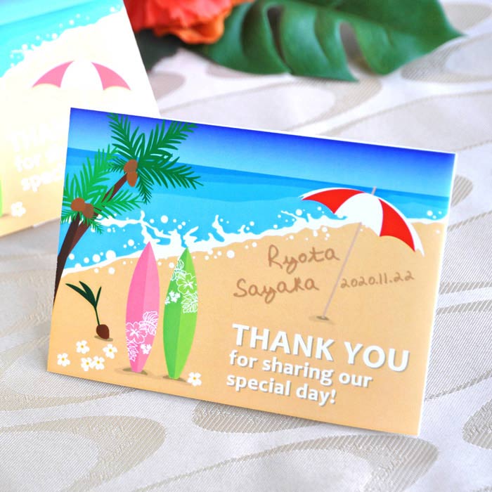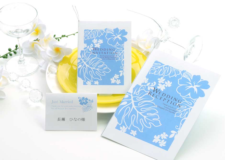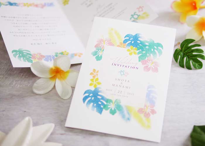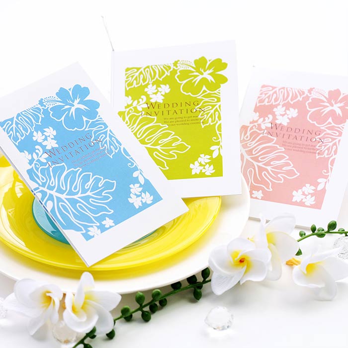 招待状もせっかくならゲストが挙式に行くのが楽しみになるようなリゾ婚ならではのデザインを選んでみてはいかがでしょうか?ハイビスカスやトロピカルな柄の招待状は見るだけでリゾート気分もUP!