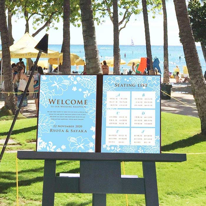 - 通常、リゾートウェディングなどで席次表を使用することはないですが、シーティングチャートをご用意されるのがおススメです。ファルベでは持ち運びが便利な折り畳み式の席次表兼ウェルカムボードをご用意しています。