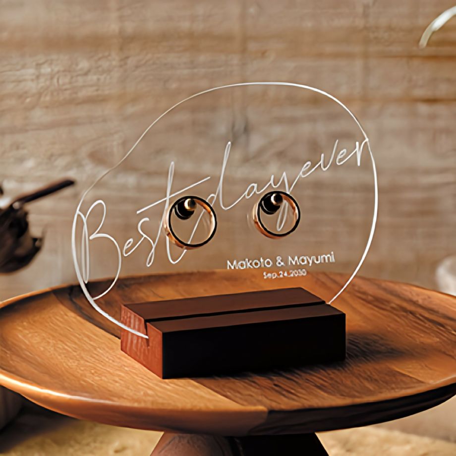 天然木ならではのあたたかみが魅力的なリングボード。お二人のお名前、挙式日をレーザー刻印で名入れできます。時とともに味わいを増す木製のリングボードは、二人の一生の宝物に。