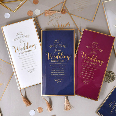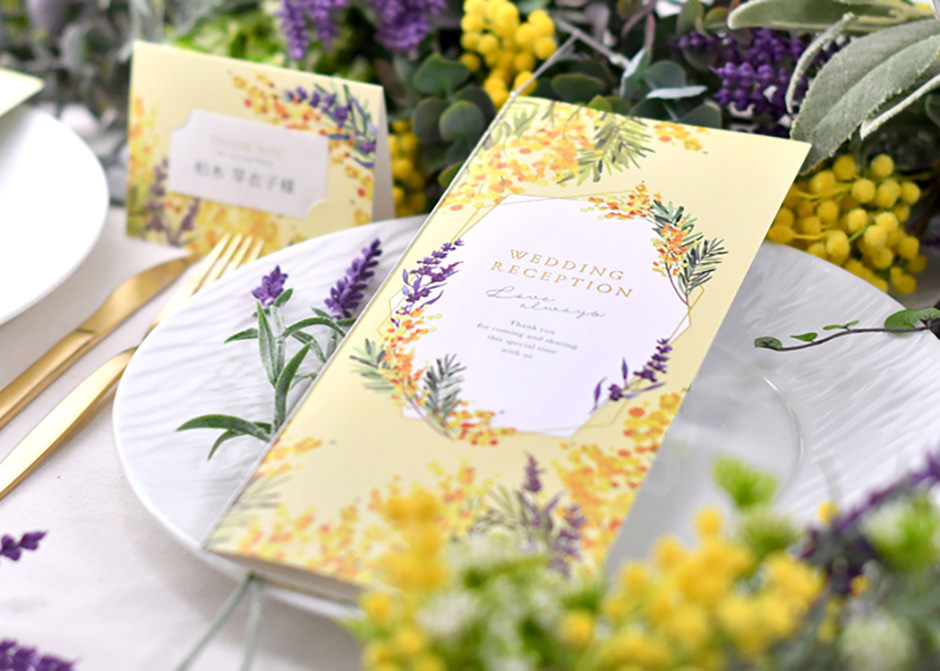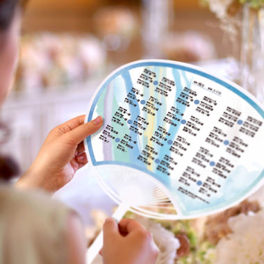 席次表とは当日のパーティー会場での座席表で、ゲストのお名前や肩書きが記載されている印刷物です。座席表だけというタイプは少なく、お二人からゲストさんへのご挨拶文や当日のメニュー表、プロフィールなど内容は様々。