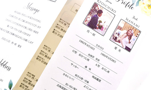 読み物としてゲストさんに楽しんでいただけて、おふたりのことをよりゲストに知っていただけるような内容を記載します。写真を入れたりプロフィール項目を独自のものにアレンジしたり。内容や形式はおふたりらしいアイディアで。