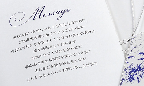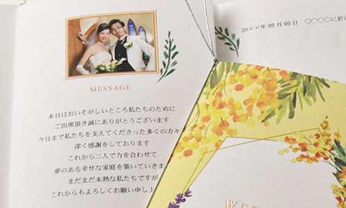 祝福してくださるゲストへの感謝の気持ちを忘れずに。結婚式のペーパーアイテムでは一律「NGワード」と呼ばれる表現(句読点や忌み言葉)があるので、オリジナルメッセージ文を考える際は注意が必要です。→手作りするなら知っておきたいNGワード“句読点”と“忌み言葉”